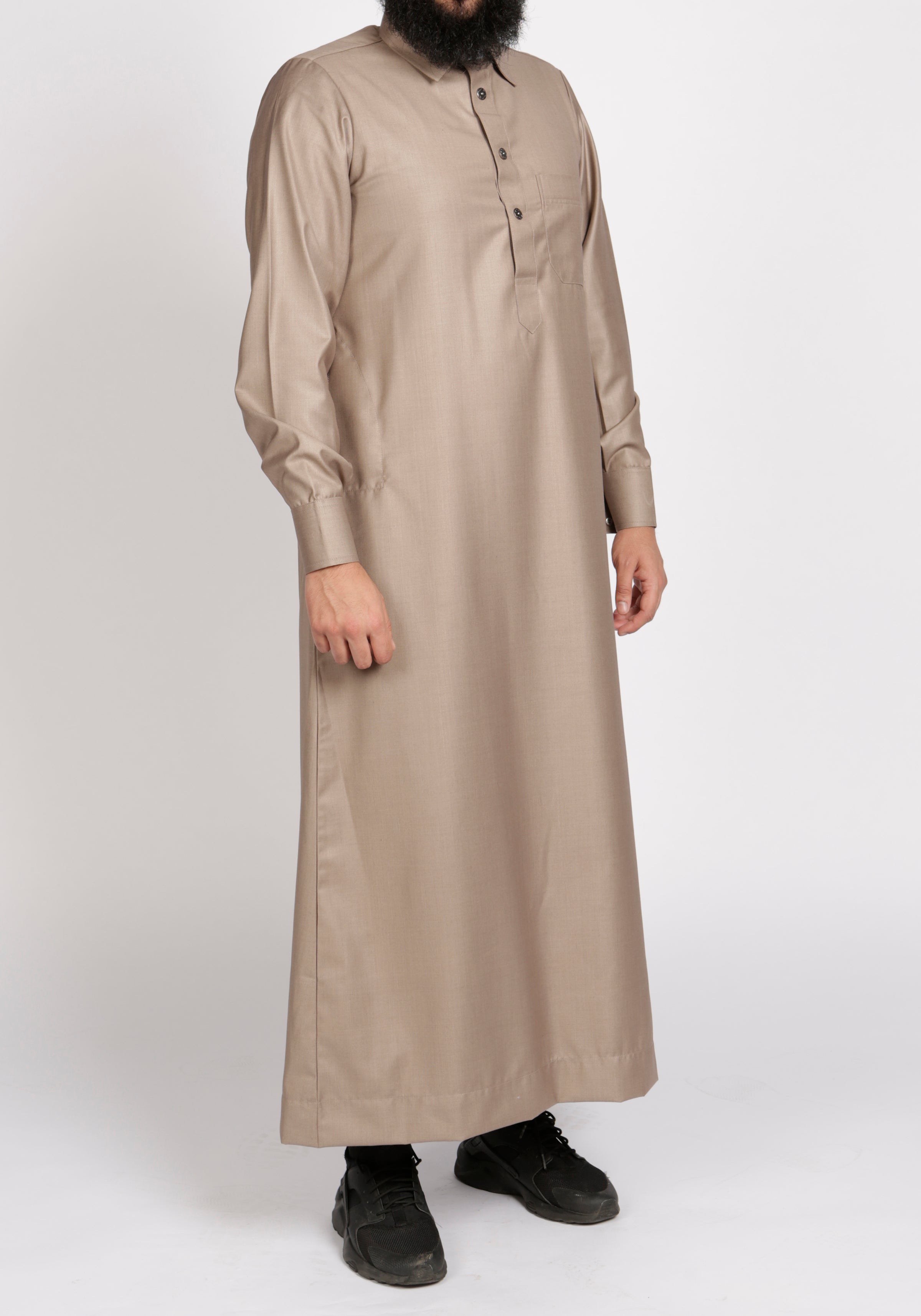 If You're looking to wear something that will make you stand out, this thobe is the one. It features shirt like collars with a contrast white around the neck. The fabric consists of a mid weight suiting blend fabric with push buttons, so you take all day getting dressed, and simply get out there and look the part.